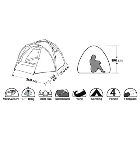 Flash-touch-system - blixtsnabbt uppsättning och nedpackning. Stabilt tält med kraftiga glasfiberstänger och många vindbarduner. Plats för fyra personer och bagage i detta praktiska tält. Vattentäthet på 3000mm vattenpelare och 5000mm på golvet. Innertältet har ståhöjd på 190cm. Vikt: Ca.10 kg. Mått innertältet: ca 260cm x 260cm, yttertältet 150cm. Mått nedpackat: 90cm x 25cm x 25cm.