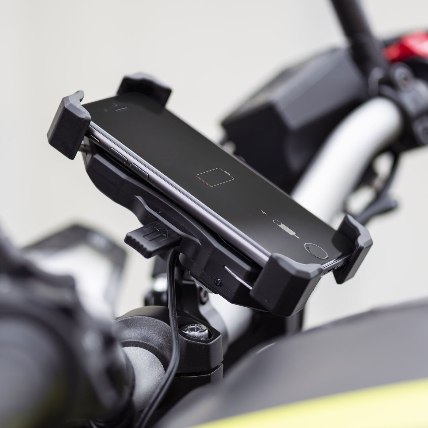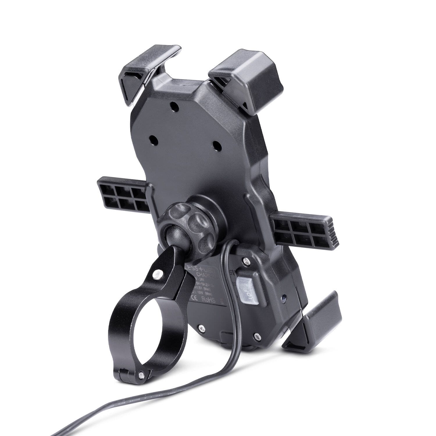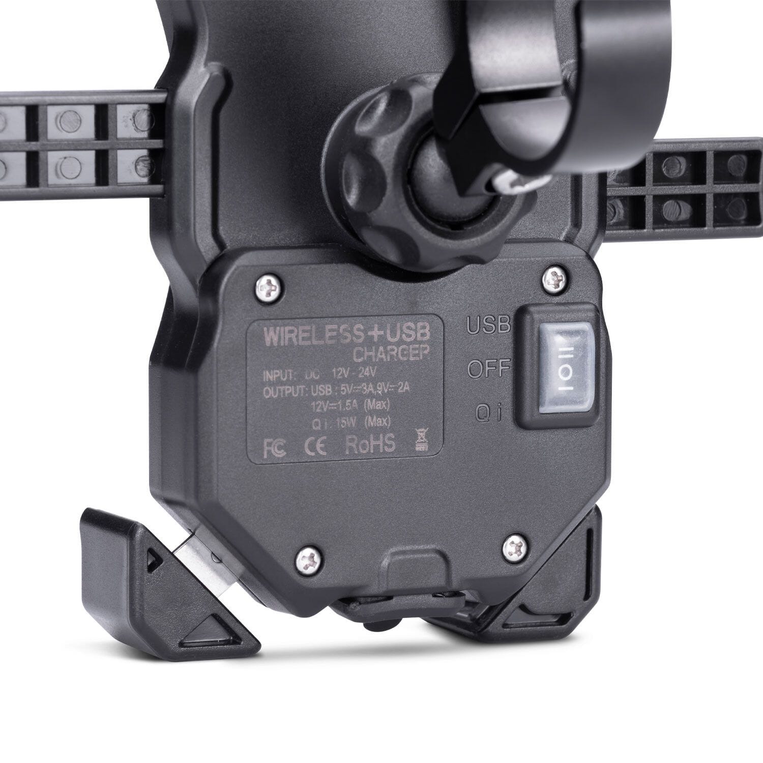 Genom FOUR HOOKS SECURITY SYSTEM ™ som garanterar det säkraste fästet av smarttelefonen till fästet. Den är utrustad med trådlös laddning för att hålla enheten alltid laddad. Den är också utrustad med en USB-kontakt för att ladda enheter som inte är kompatibla med trådlös laddning.