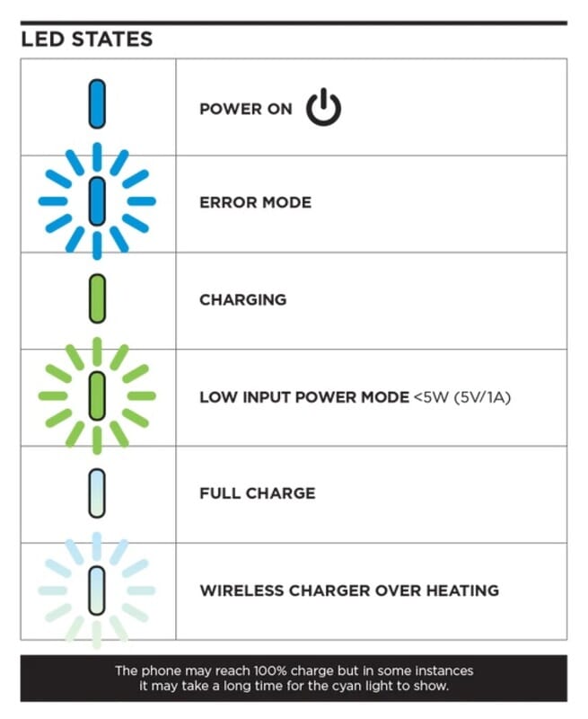 Snabbladdning (7,5W och 10W) kräver 9v strömförsörjning (ingår ej).