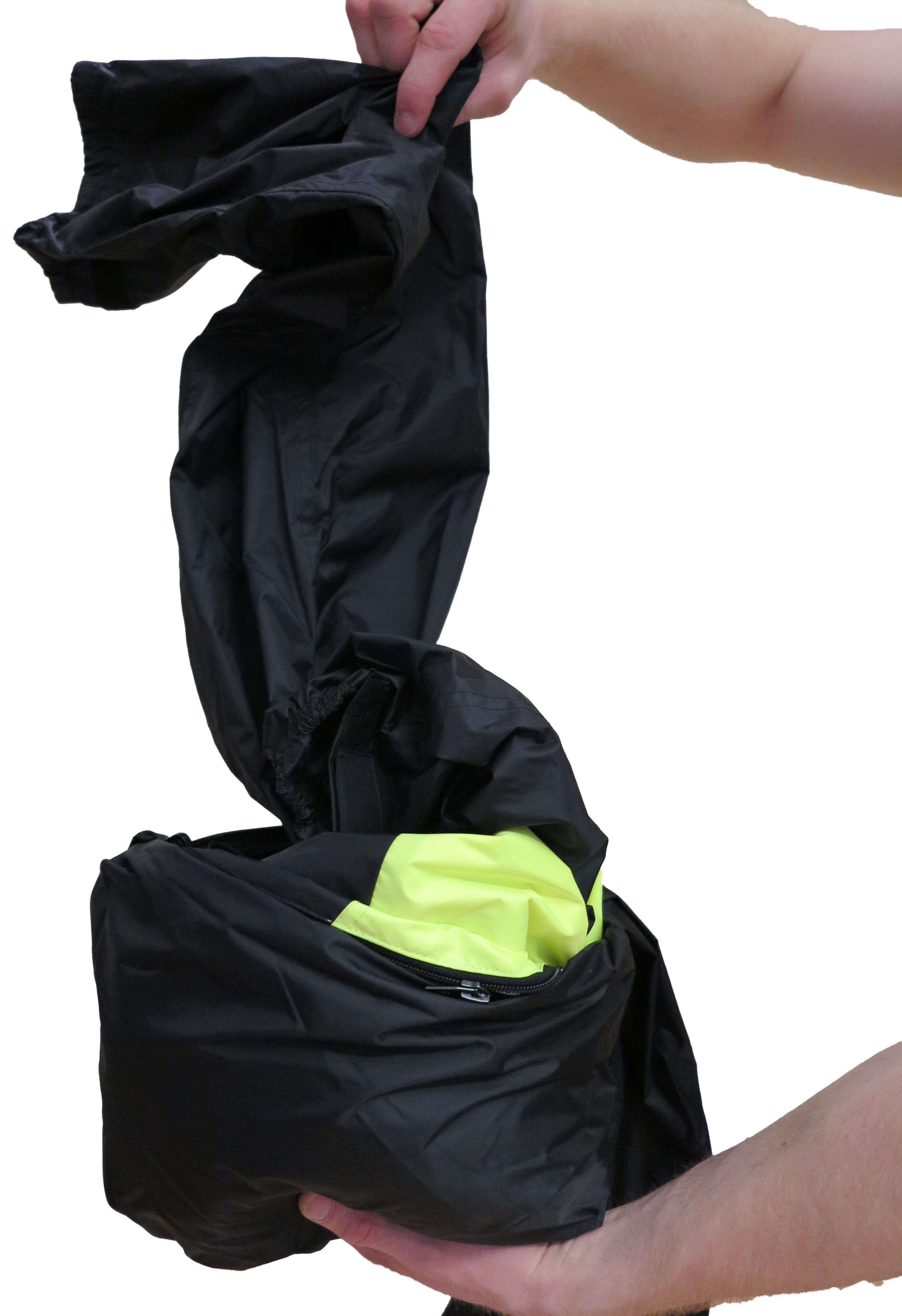 - Regnkläderna kan packas ned i vänster bröstficka